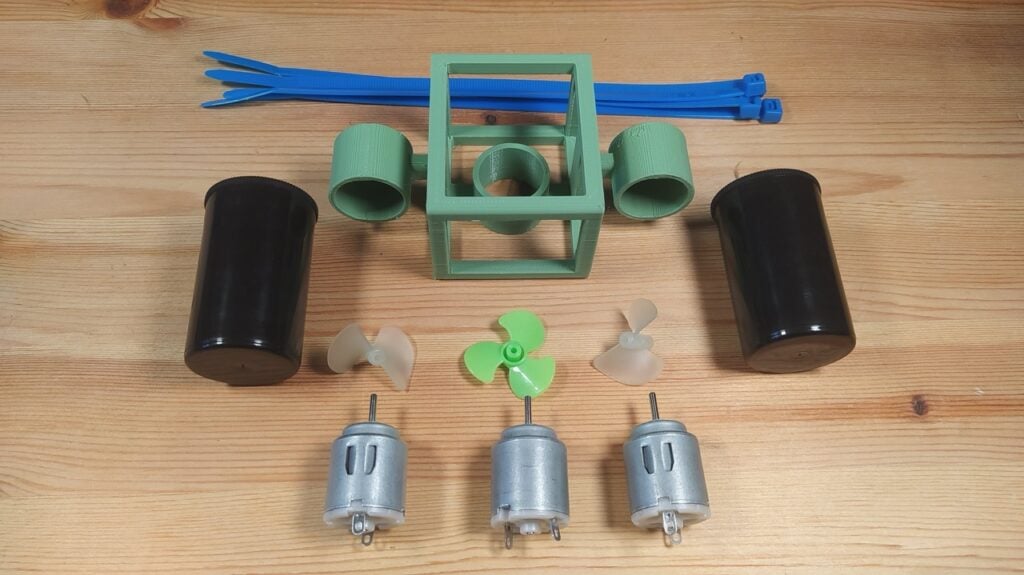 Figure 1: The main structural components for a TOUV — a chassis frame, 3 × 30mm motors, 2 × 35mm film canisters, some propellers, and some cable ties