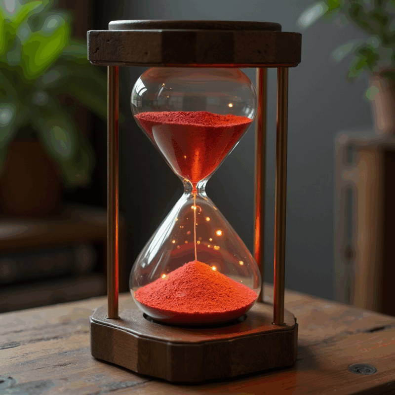 A traditional glass egg timer-style timer in a wood and brass frame, with red-coloured sand trickling from the top to the bottom. It looks as though about half the time is remaining.