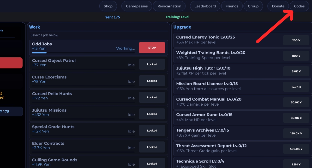 - Look for the Codes button (usually at the top-right of the screen).